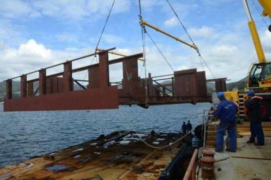While the cables and grips of the block are being prepared by the factory’s team for the flag-raising, a pontoon cruises all the estuary dragged by one of the ships of Botamavi, Rada primero, from the facilities of Freire shipyard, its owner. Freire Uno is installed in parallel to the dock of A Xunqueira and starts the slow maneuver. “Whe may go step by step”, assures Brañas. In around half an hour the heavy piece lays on the pontoon, which will use other 30 minutes to cross the estuary and arrive at its destination. “There are not many companies in the estuary that can produce blocks of this size and move them through the sea”, explains Brañas.