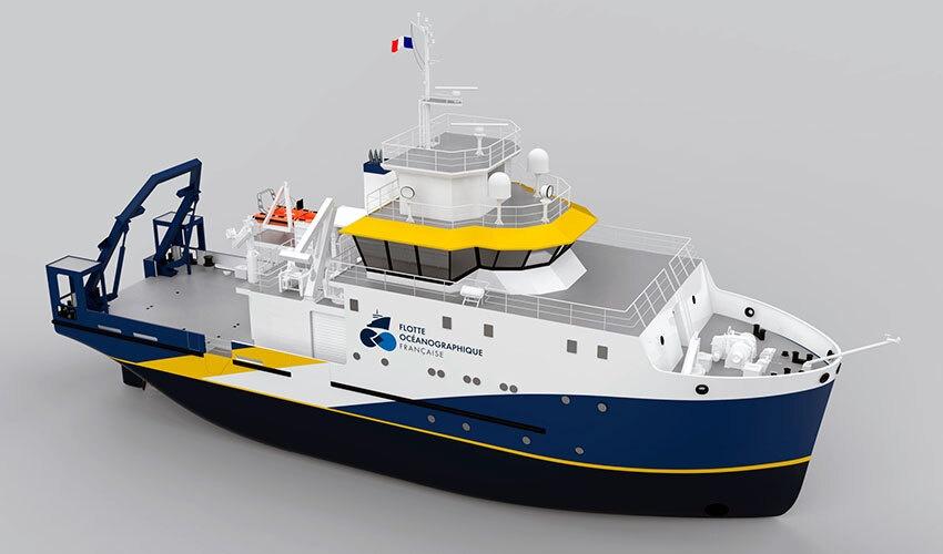 The French-flagged oceanographic will have a length over all of 40.30 meters and reduced draft. The Vessel will deal with all disciplines of oceanography in Atlantic coastal areas: geosciences and paleoclimatology, physical oceanography and biogeochemistry, biological oceanography, and ecosystem functioning, from the coastline to the continental shelf. She will also perform duties related to fishery on the continental shelf and will accommodate a crew of 12 people and 10 scientists, allowing for training campaigns with teachers and students on board.